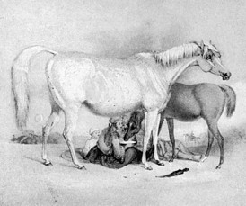 ... [H]e is entirely dependent upon her for his happiness, his glory, and, indeed, his very existence. An Arab possessing a horse unrivalled in speed and endurance ... is entirely his own master, and can defy the world.... Without his mare, money would be of no value to him. It would either become the prey of someone more powerful and better mounted than himself, would be spent in festivities, or be distributed among his kinsmen. He could only keep his gold by burying it in some secret place, and of what use would it be then to one who is never two days in the same spot...? |