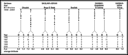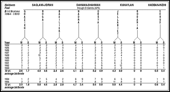 Horses of the Saqlawi-Jidran (Ibn Sudan) strain tracing directly to Ghazieh (AP) show a steady decline in the birthrate from a high of 7 foals in 1984 to the birth of a single filly in 1993. The successful foaling seasons of 1994-95 added only 8 foals to this endangered strain.